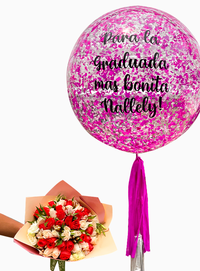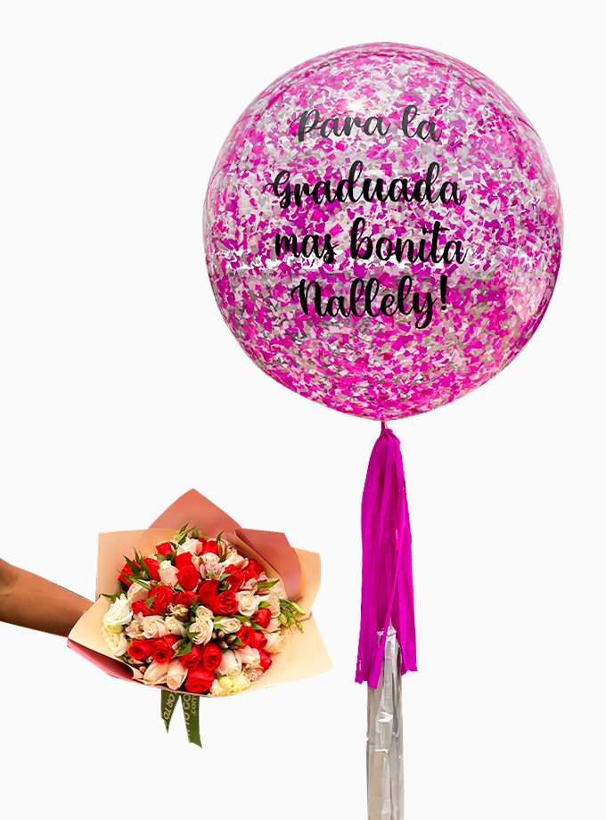 Regala este lindo globo burbuja transparente con confeti color rosa y plateado, todo para sorprender a esa persona especial, junto a un hermoso ramo de 24 rosas especial para las graduaciones ¡Personaliza este globo con una frase a tu elección!